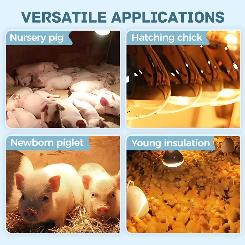 ЗДРАВОСЛОВНА И ТИХА РАБОТА – Тези лампи работят без излъчване, шум или консумация на кислород. Това създава по-спокойна и по-здравословна среда за животните, като спомага за по-добър растеж и намалява стреса. Тихата работа също така гарантира, че работниците във фермата могат да работят наблизо без прекъсвания, което спомага както за благосъстоянието на животните, така и за комфорта на работниците.