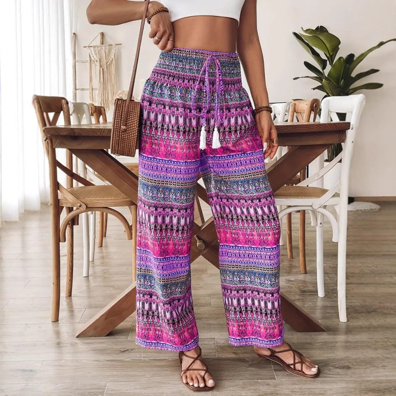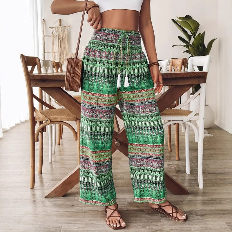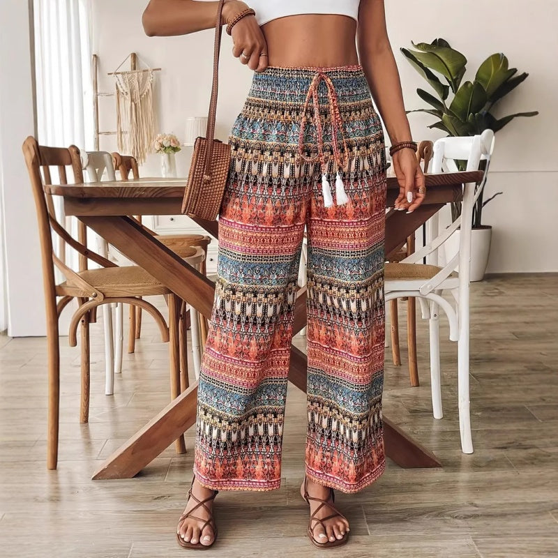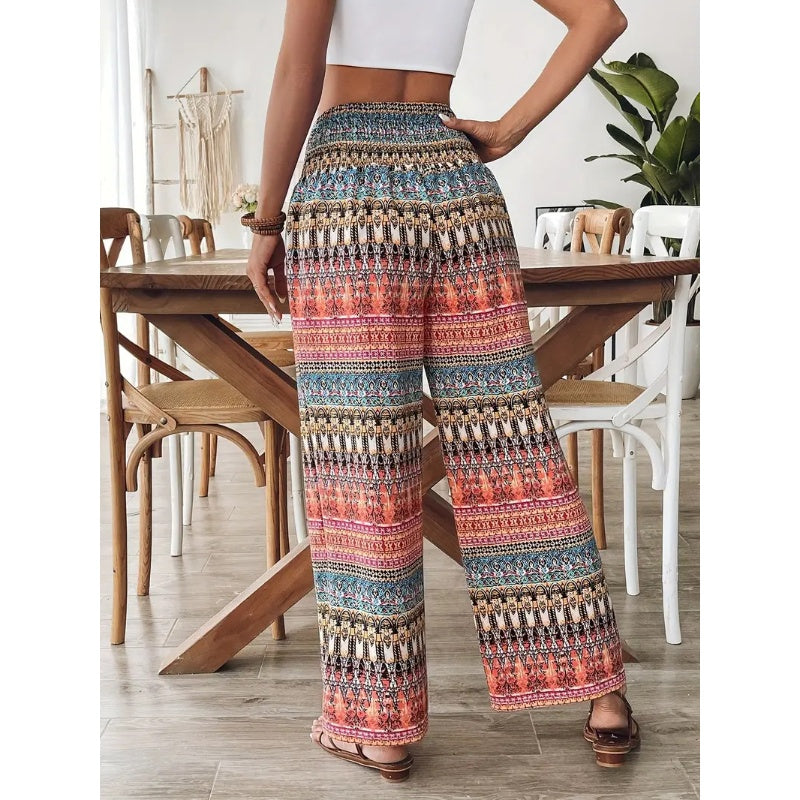 БОХО ПЕЧАТ – ДОБАВИ СТИЛ КЪМ ВСЕКИДНЕВНИТЕ ВИ ОДЕЯЛА: Подобрете ежедневния си гардероб с тези ярки Бохо Печатни Панталони с Висока Талия. Проектирани да се открояват, еклектичните бохемски шарки правят всяка двойка изявление. Без значение дали са комбинирани с основна тениска или лека блуза, печатът добавя характер и без усилие елегантност, идеален за уикенд пазари, разходки по плажа или неформални срещи.