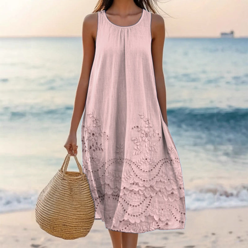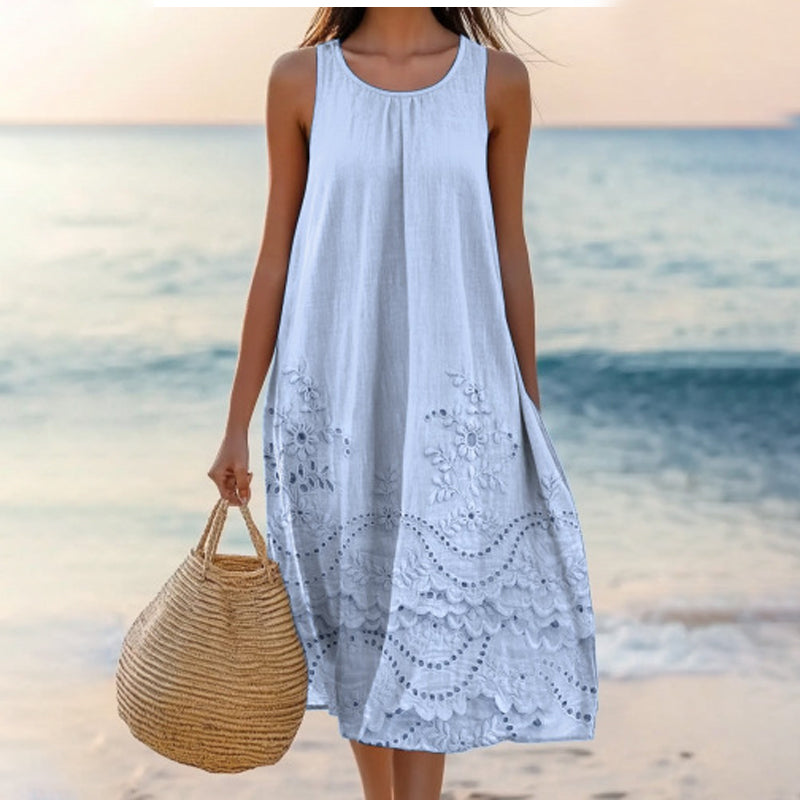РЕЛАКСИРАЩ И ПЛОВДИВ СИЛУЕТ - Проектиран със свободен, плавен силует, който подхожда на различни форми на тялото. Кръглото деколте и дължината над коляното създават балансирана, стилна визия без усилие.