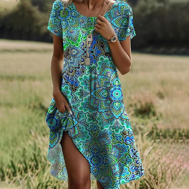 ДИЗАЙН НА ПОДАРЪКА, КОЙТО ЗАПЛАЩА ОЧИТЕ: Подобрете стила си с тази рокля със смел и ярък дизайн на принта за модерна и елегантна визия, идеална за небрежна вечер или полуофициално събитие.