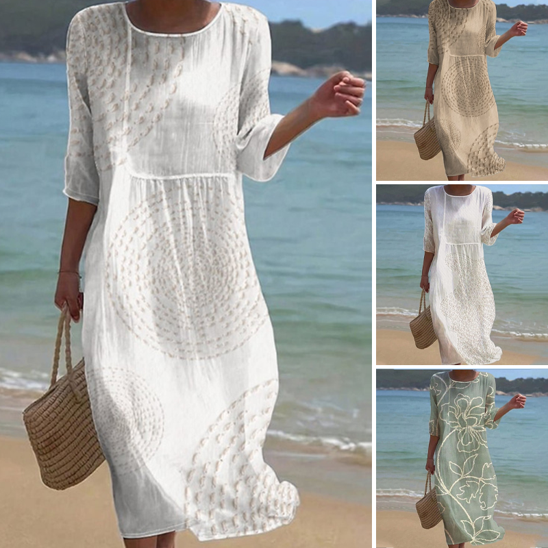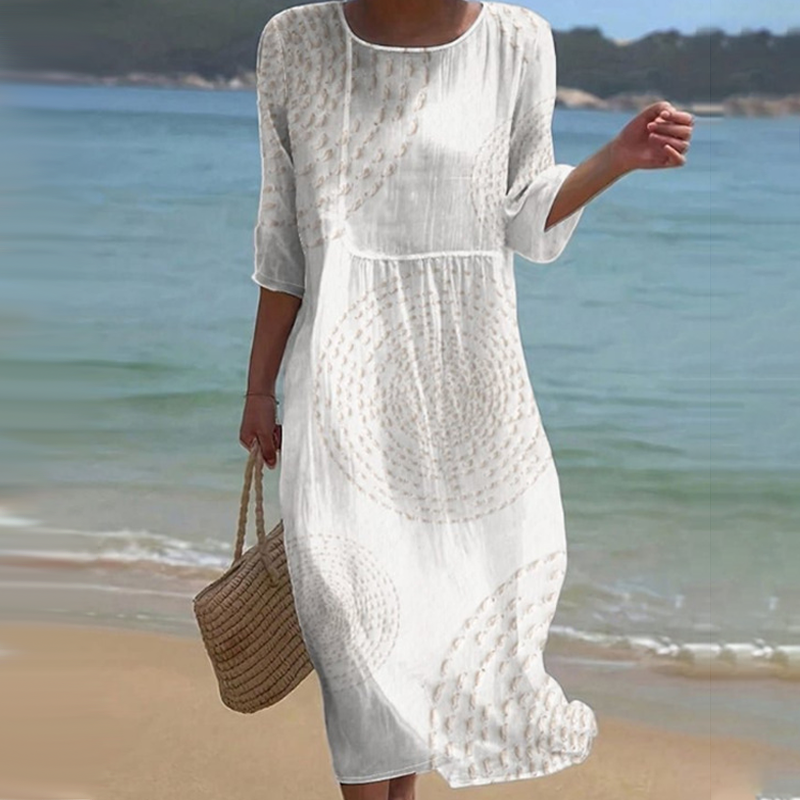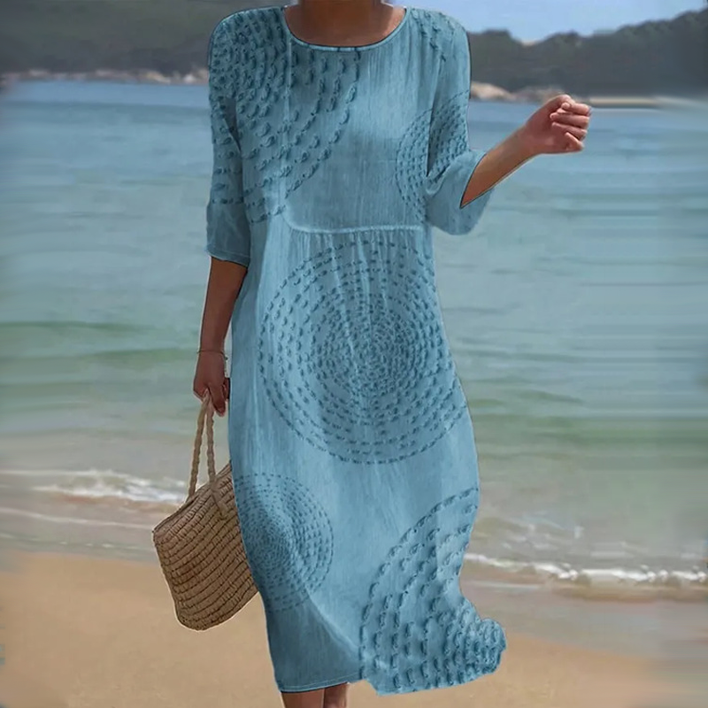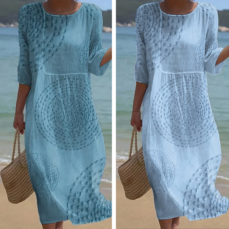 Тази рокля, със своята свободна кройка и фин кръгъл десен, перфектно пресъздава спокойния блясък на живота край морето. Дишащата материя от памучна смес осигурява целодневен комфорт, осигурявайки уют, независимо дали се разхождате по плажа, или се наслаждавате на спокойна вечер.