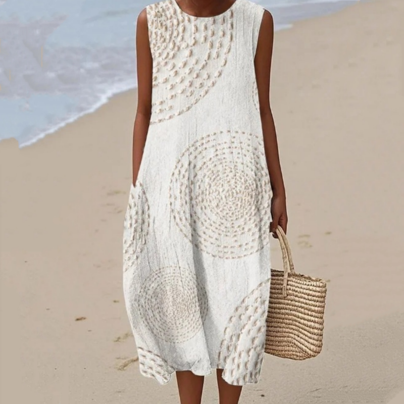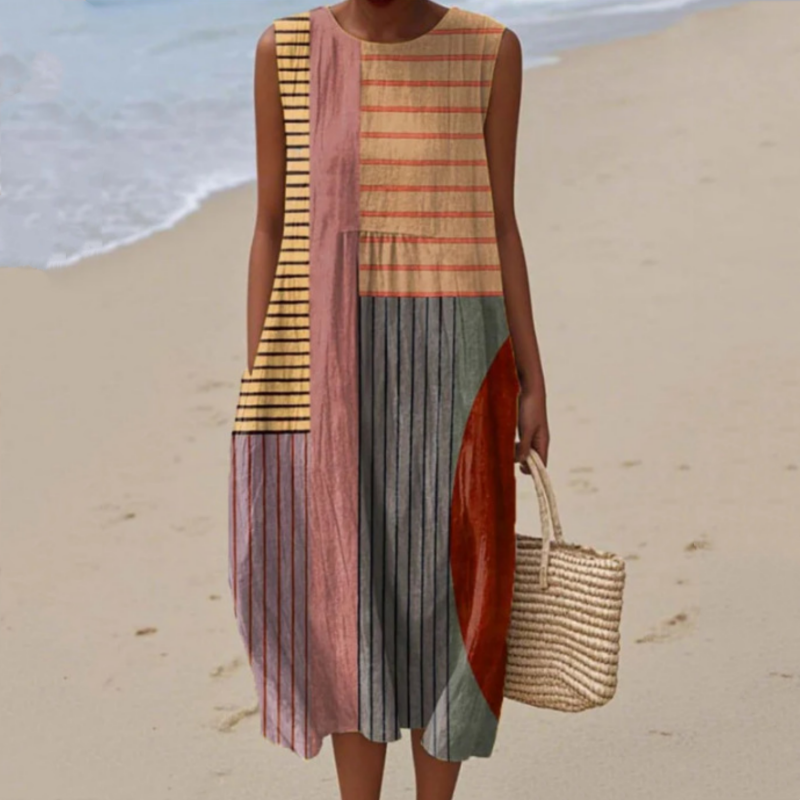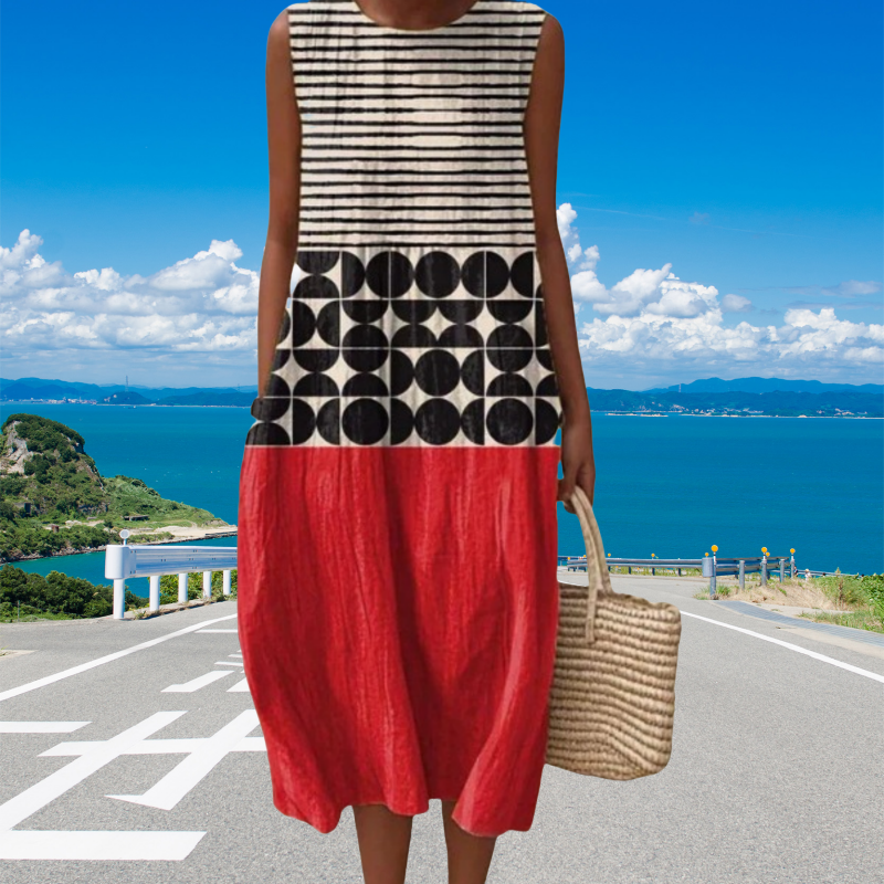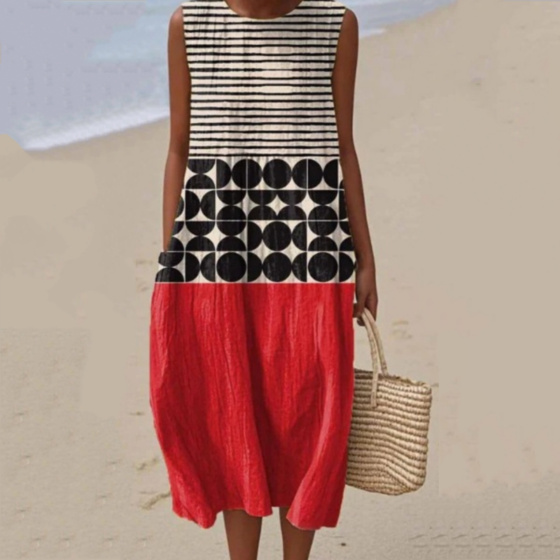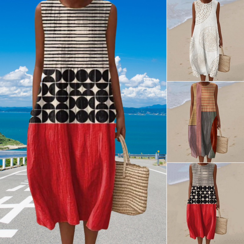 ЕЛЕГАНТНА Кройка без ръкави - Тази рокля е идеална за топлото време, с кройка без ръкави. Останете хладни и стилни, като същевременно се наслаждавате на свободата на движение, което я прави идеална за слънчеви дни или ваканции.