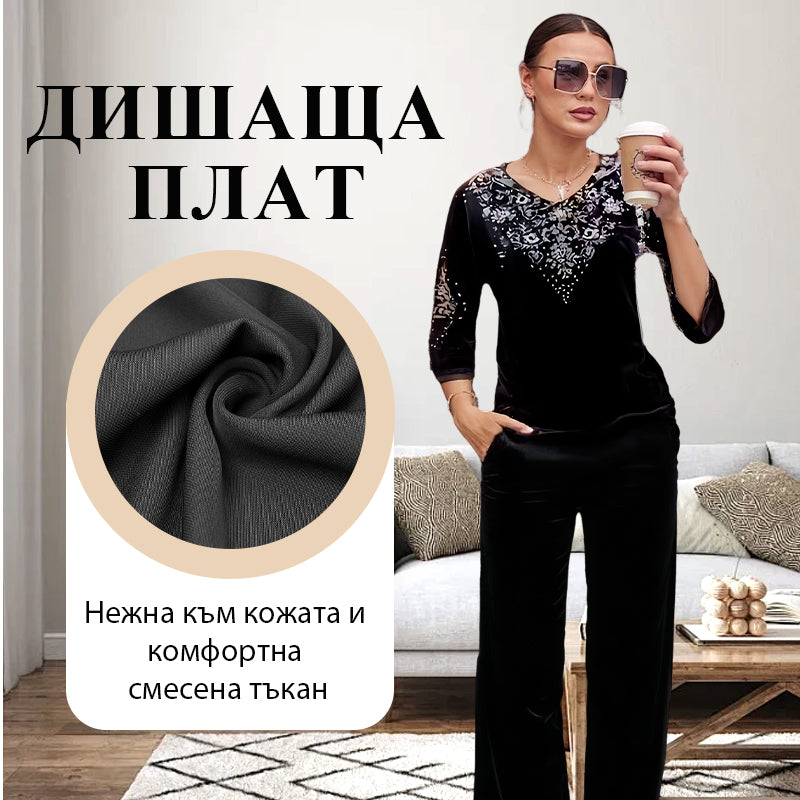 БЛЕСТЯЩ КАДИФЕН МАТЕРИАЛ С УКРАСА ОТ СТЪКЛЕНИ КАМЪНИ – Комплектът е изработен от елегантен, блестящ кадифен материал, който улавя светлината и създава изтънчен вид. Блестящите стъклени камъни подчертават дизайна, което го прави идеален за добавяне на изтънченост към всеки повод.