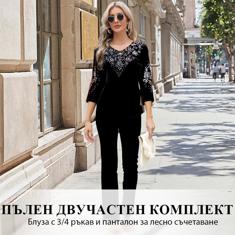 ЦЯЛОСТЕН ДВУЧАСТЕН КОМПЛЕКТ – Този комплект включва блуза с 3/4 ръкави и панталони в същия цвят, предлагайки цялостно облекло, което изисква минимални усилия за стилизиране. Идеален както за неформални излизания, така и за официални събития, той ви гарантира, че винаги ще бъдете облечени стилно и с лекота.
